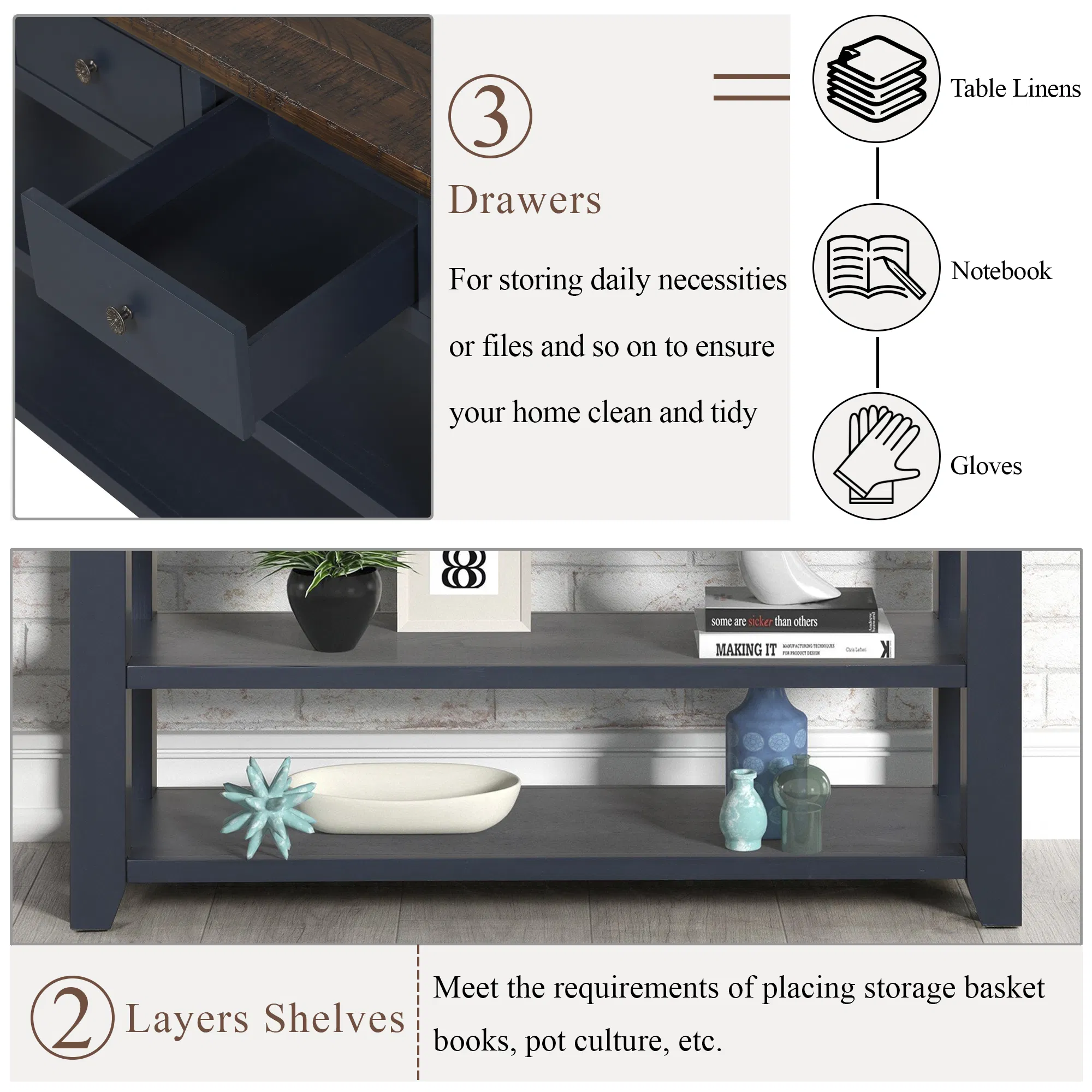 • Three spacious drawers for keys, mail, or essentials