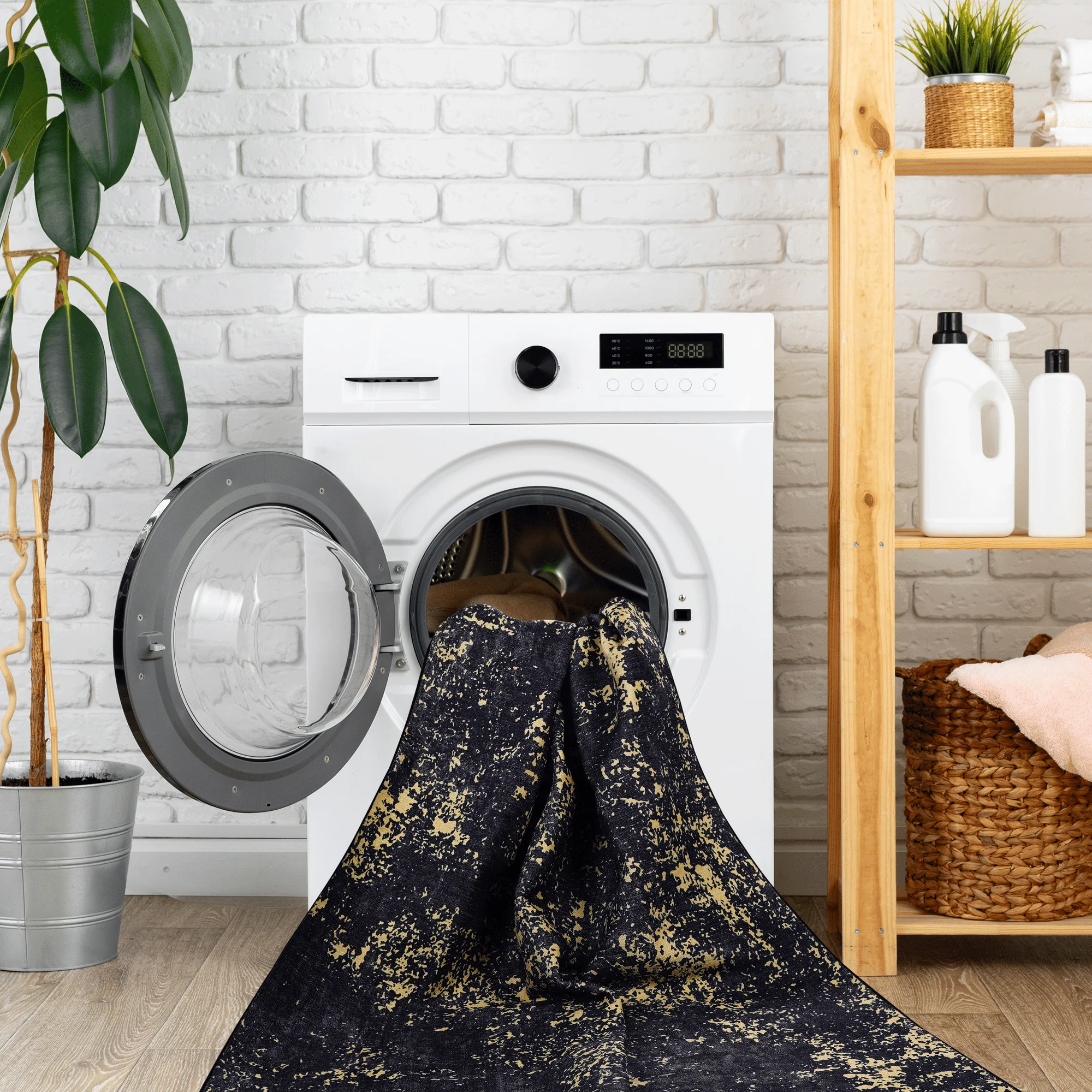 This 5×8 rug combines everyday functionality with a touch of glamour. Its refined palette of black and gold elevates your décor, while the non-slip, washable construction ensures simple care. A versatile accent that blends durability with polished style.
