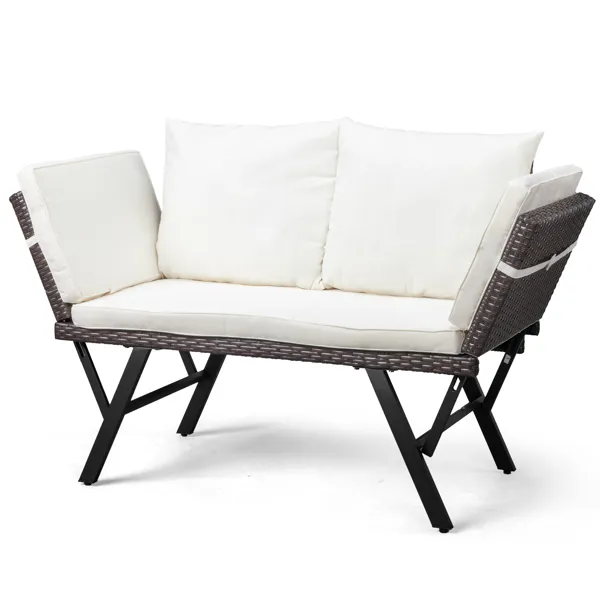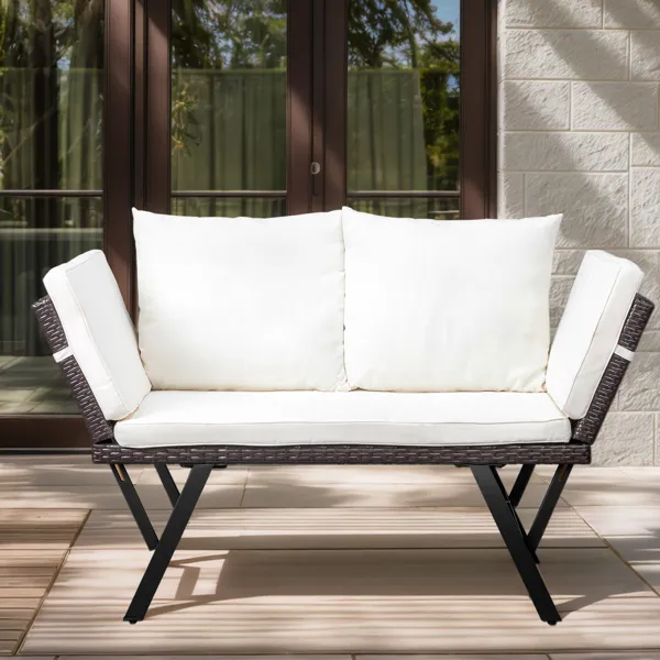 Relax in style with this multifunctional outdoor daybed, featuring a handwoven rattan frame and soft beige cushions. Its convertible design allows you to adjust armrests and transform it into a bed, lounge, or sofa. Perfect for balconies, gardens, or pool areas, this modern lounger offers durability, comfort, and a cozy escape for two.