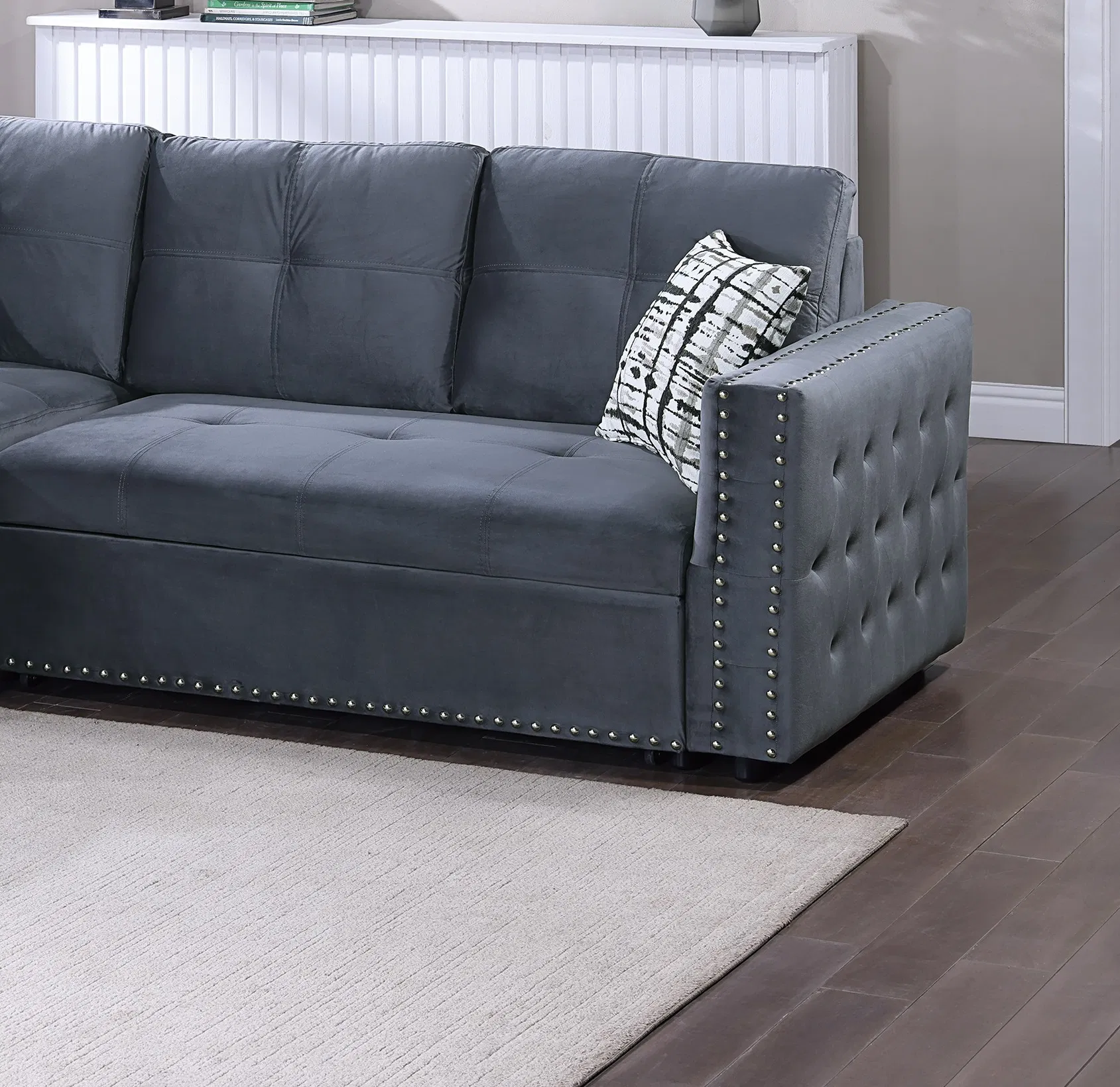 Maximize comfort and space with this modern gray velvet sectional sofa. Designed with a reversible chaise for layout flexibility, it includes a hidden storage compartment and a convenient pull-out bed. The tufted cushions, square arms, and nailhead details add sophistication, while soft velvet upholstery ensures a cozy, luxurious seating experience.