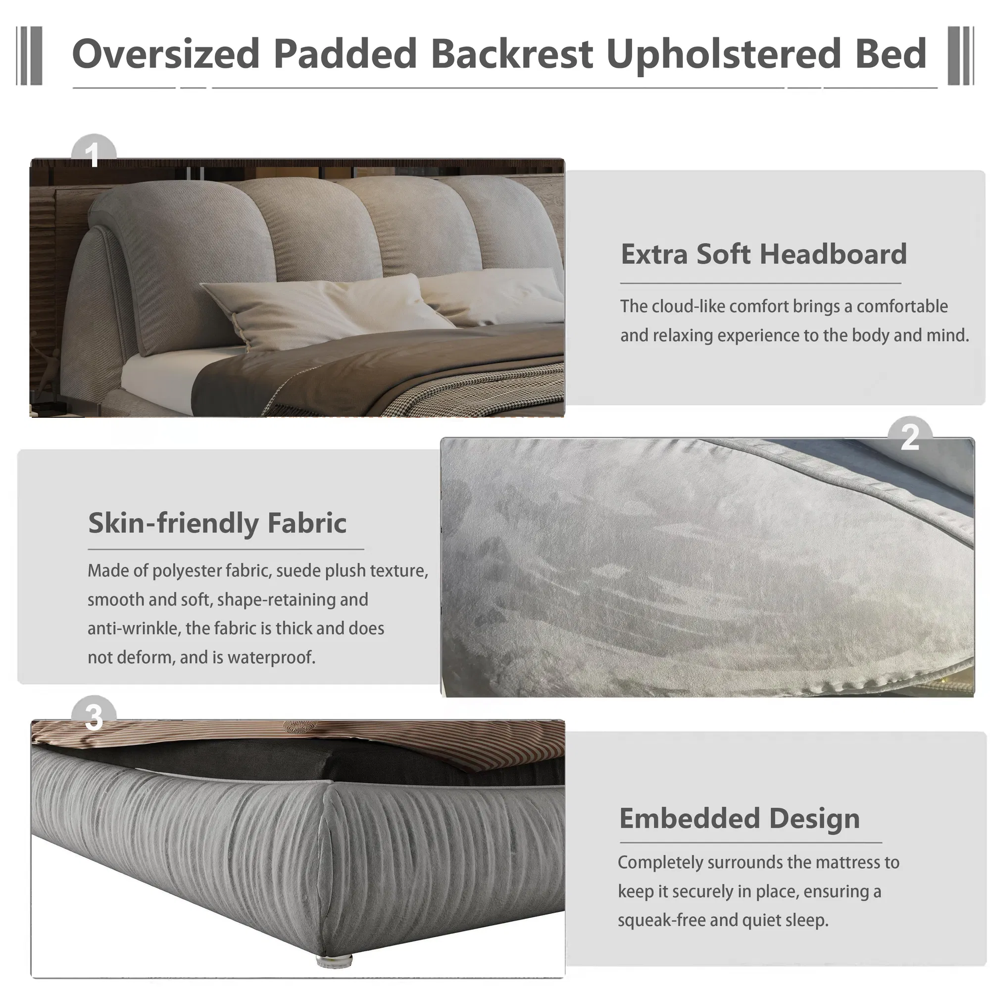 Experience the perfect balance of form and function with this elegant upholstered platform bed. Designed with an oversized pleated headboard and crafted from durable solid wood, it delivers both style and stability. The premium grey fabric offers a soft texture with refined stitching, while the low-noise slat structure ensures a peaceful night’s rest. Compatible with multiple mattress heights, this bed adapts to your comfort preferences with ease.