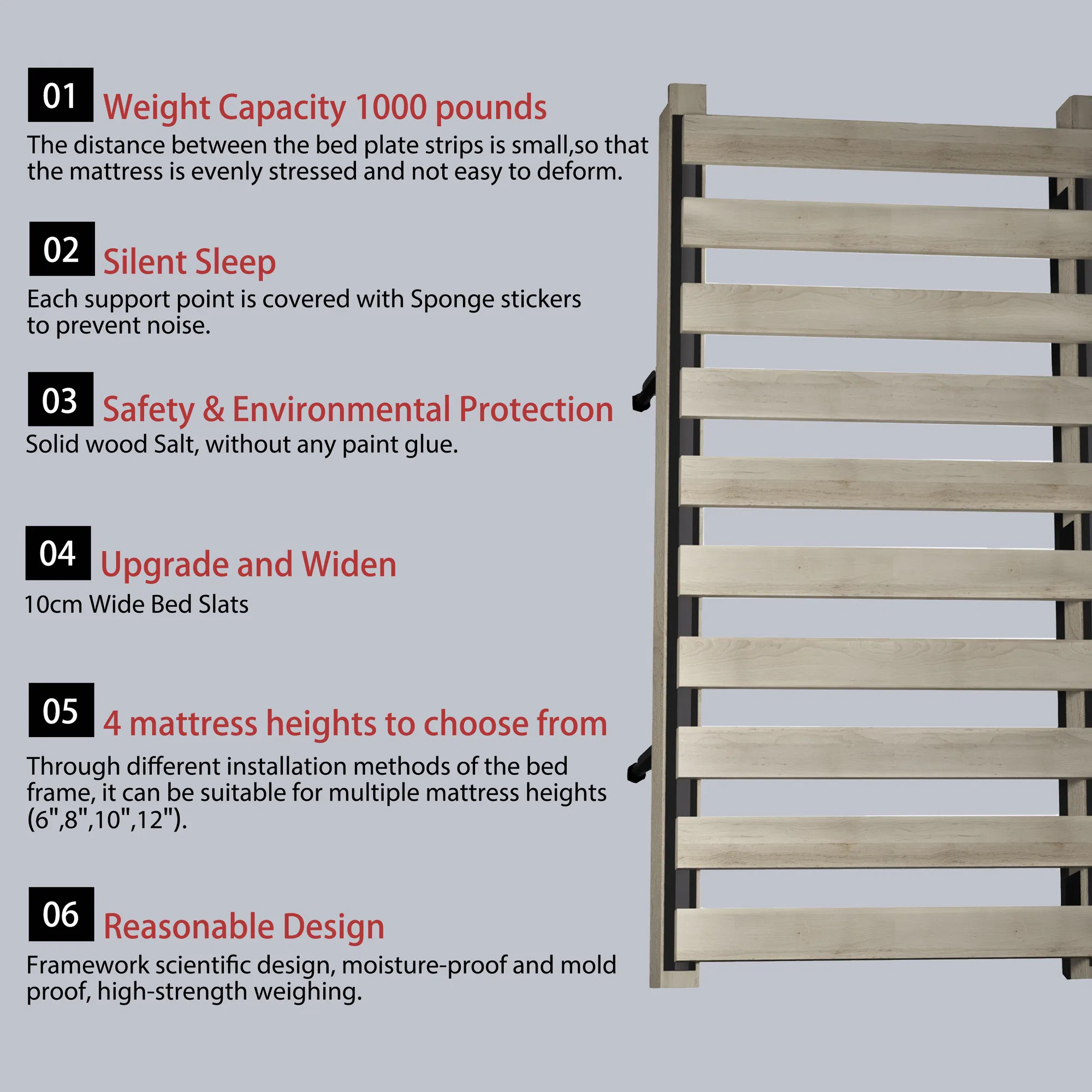 - No Box Spring Required: 20 slats ensure even mattress support and silent sleep.