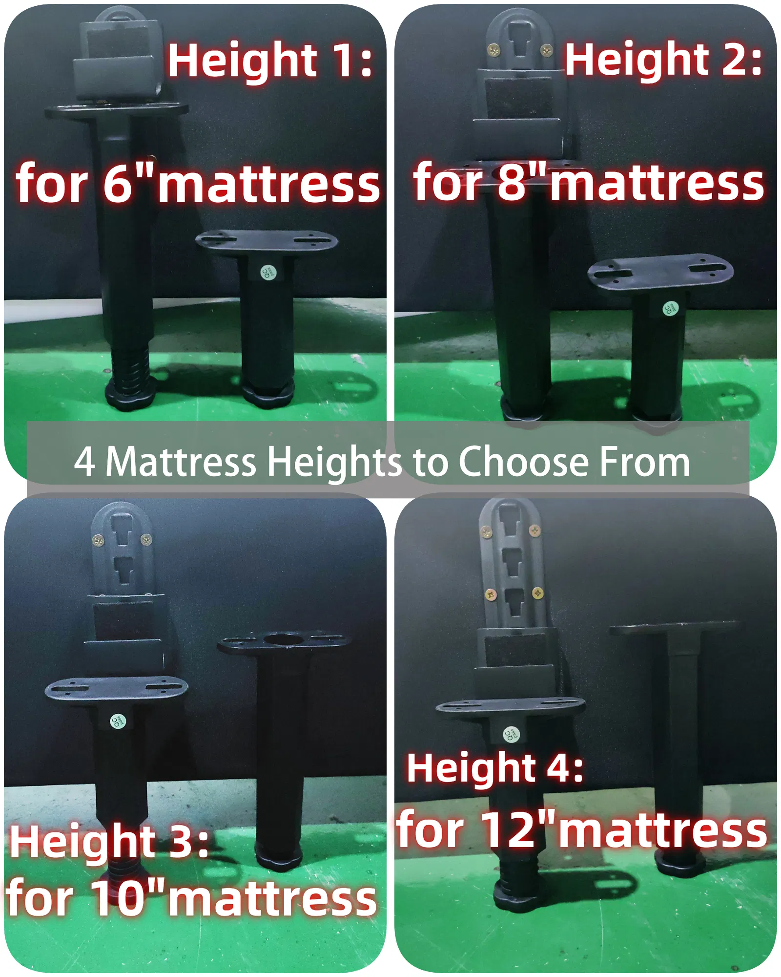 - Recommended Mattress Heights: 6″, 8″, 10″, or 12″