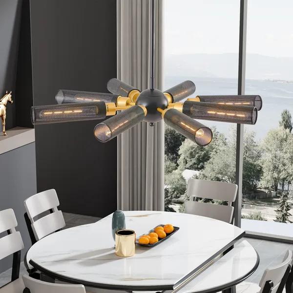 Illuminate your space and elevate your decor with this Sputnik Chandelier, a stunning blend of modern industrial style and vintage charm. Featuring a bold black and golden finish, this starburst-inspired design makes a captivating visual statement in any room. The unique metal mesh shades not only protect the bulbs but also cast a distinctive light and shadow pattern, transforming your dining room, living room, or kitchen into a stylish, captivating space.