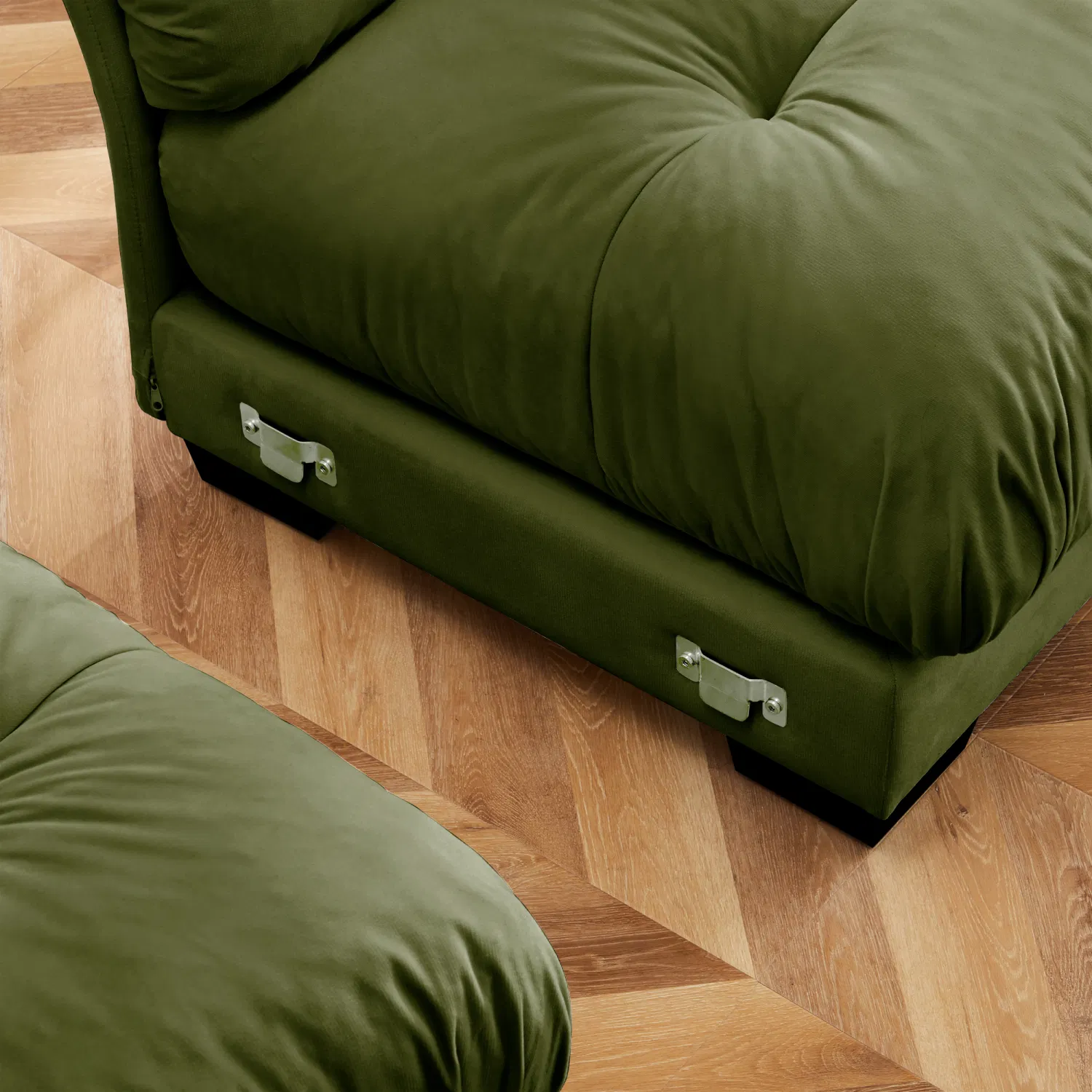 Imagine settling into a sofa that’s equal parts statement and sanctuary. The olive green velvet sets a rich tone, complemented by round armrests that feel both unique and supportive. With its plush seating, it quickly becomes the most inviting spot in the room.