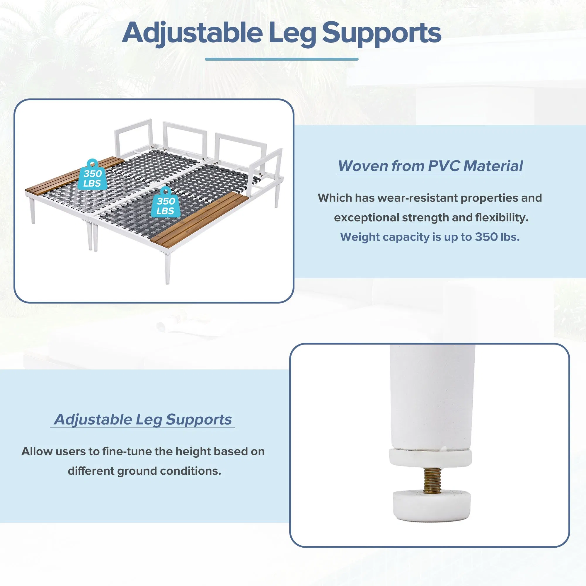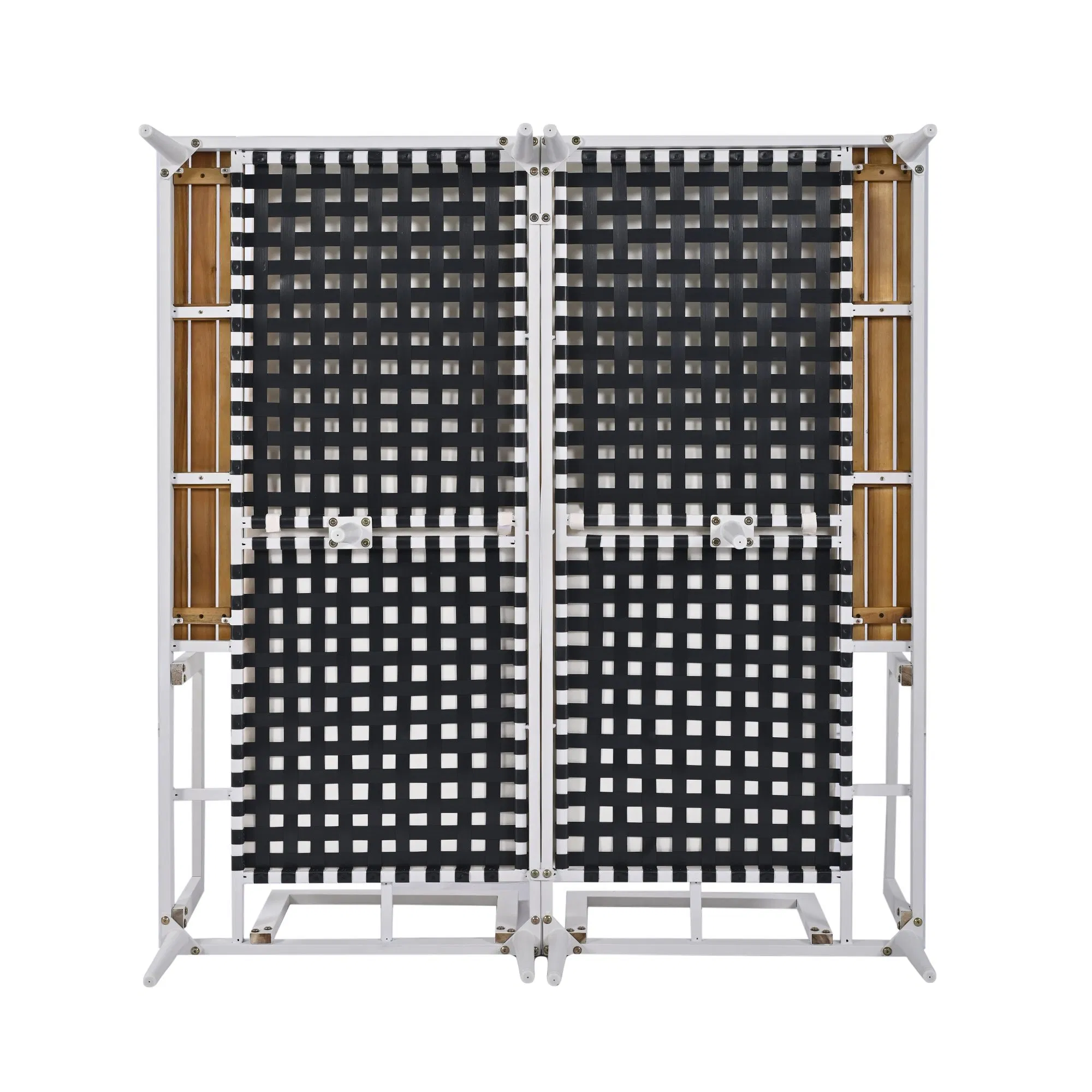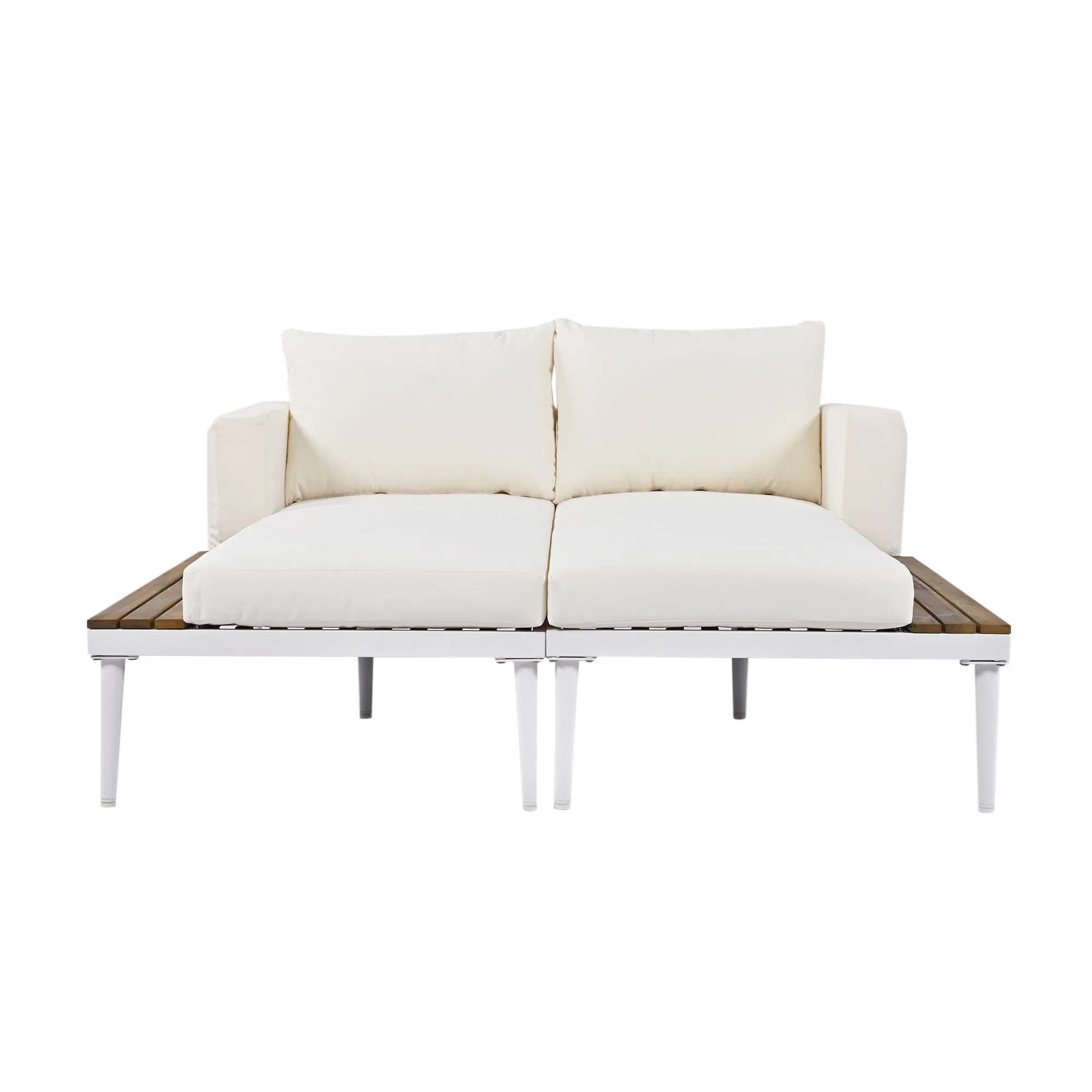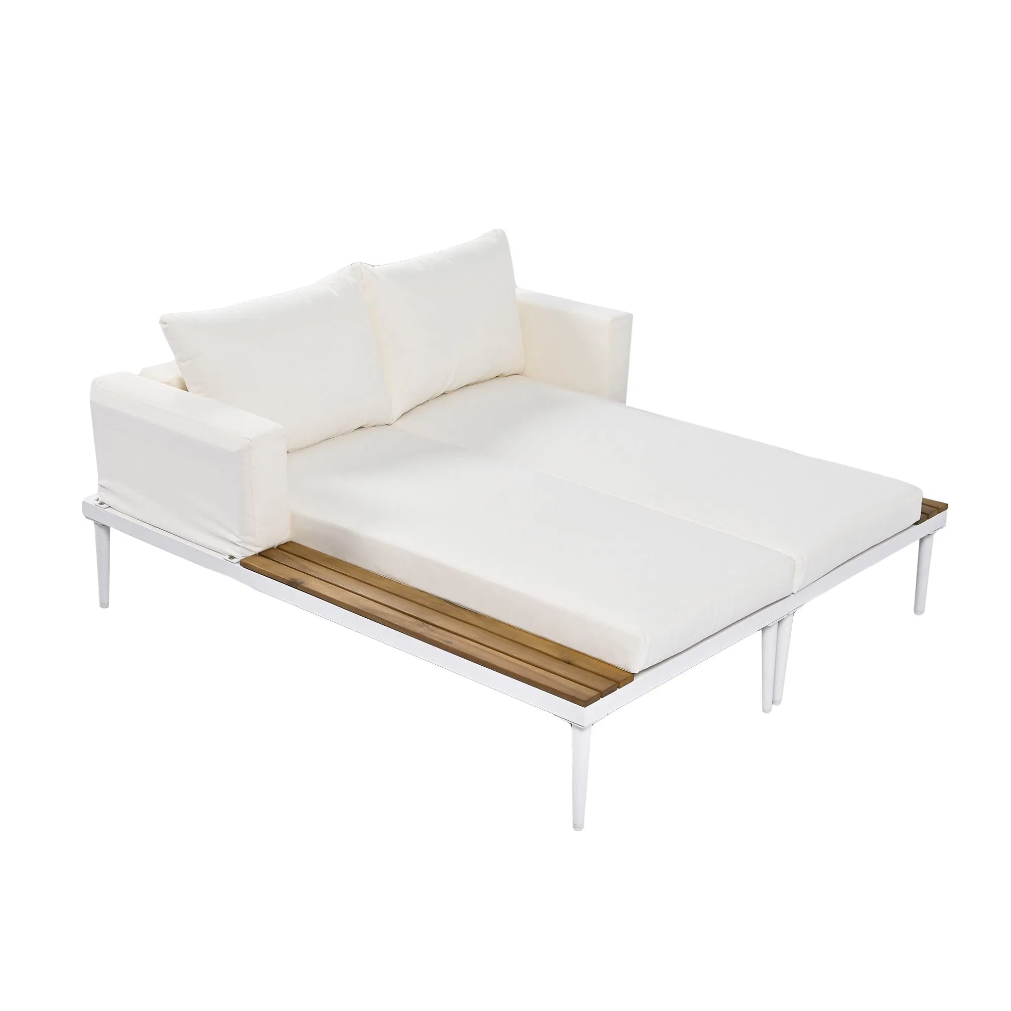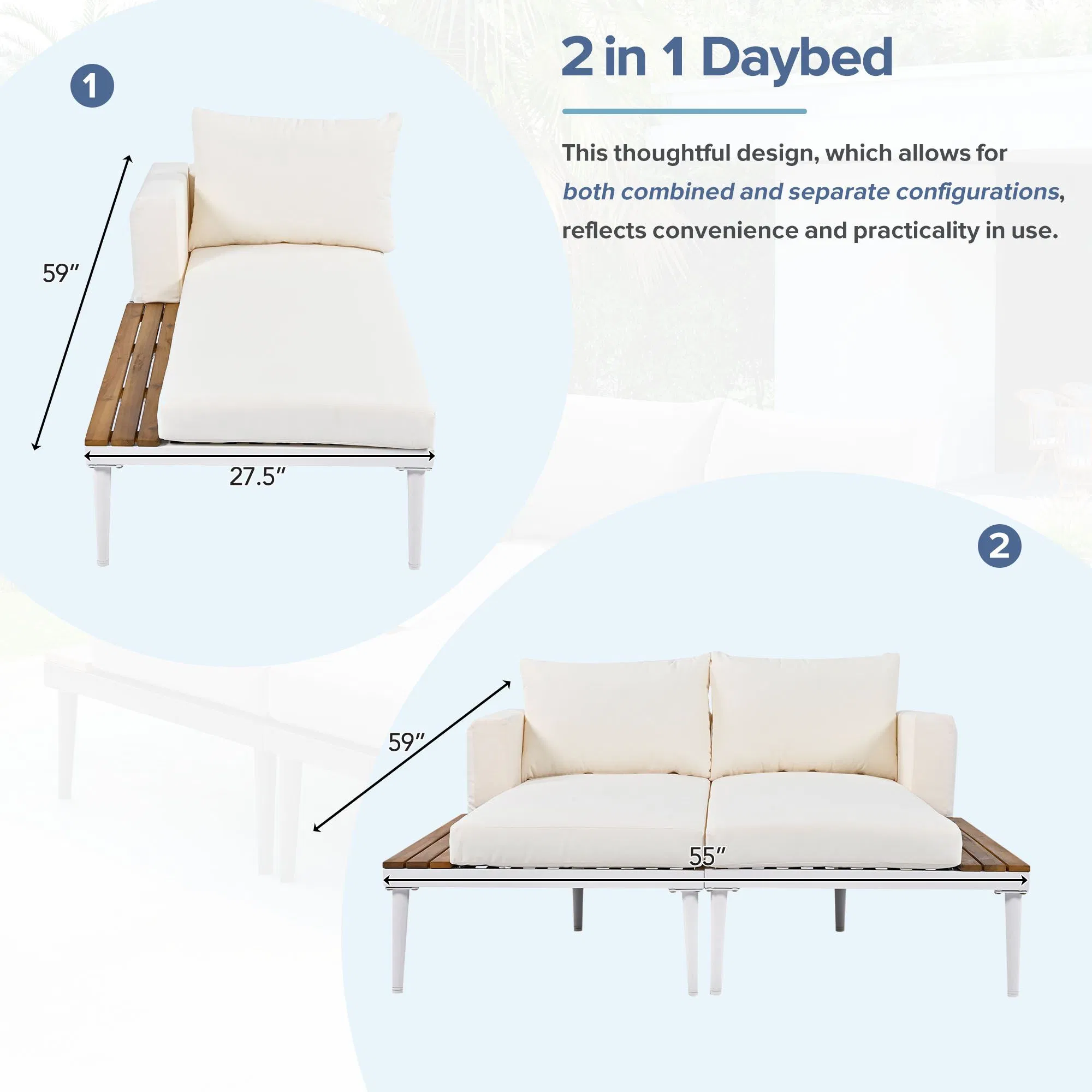 Redefine relaxation with this Modern Outdoor Daybed, crafted to complement today’s minimalist outdoor spaces. This 2-in-1 design lets you enjoy togetherness or personal lounging by splitting the 59″ wide bed into two sleek 27.5″ chaises. Its warm beige cushions contrast beautifully against the durable metal frame and natural acacia wood side tables, perfect for resting drinks or books. With washable covers, adjustable supports, and fade-resistant materials, this daybed combines everyday function with resort-style sophistication.