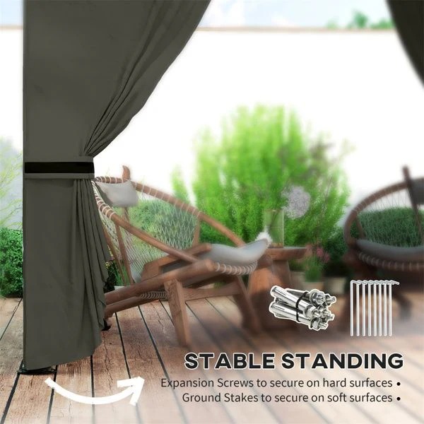 Enhance your outdoor space with this elegant dark gray gazebo featuring a unique arc roof with drainage holes and translucent church windows for enhanced viewing. The PU-coated roof and curtains offer UV20+ protection, while the powder-coated galvanized steel frame resists rust for extended durability.