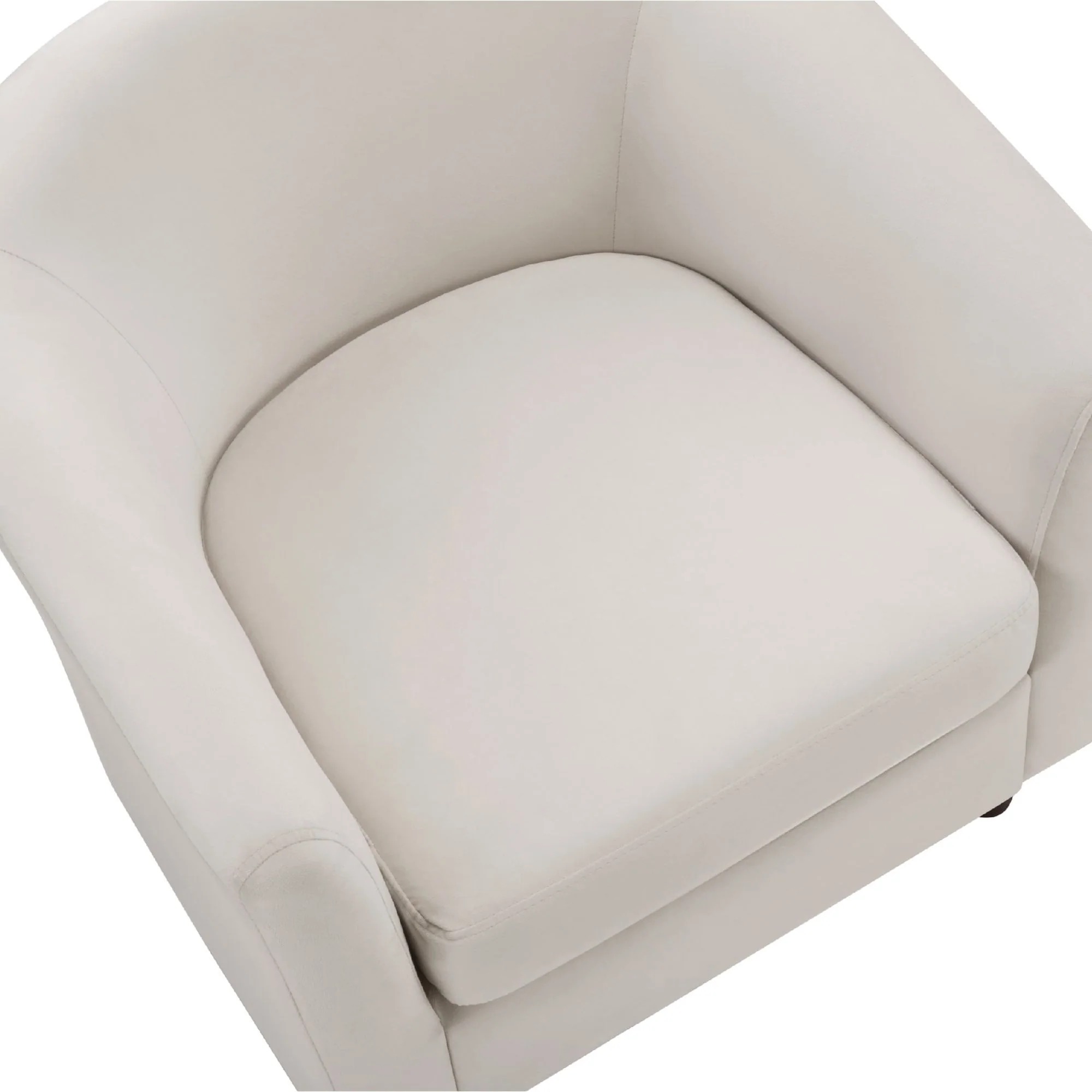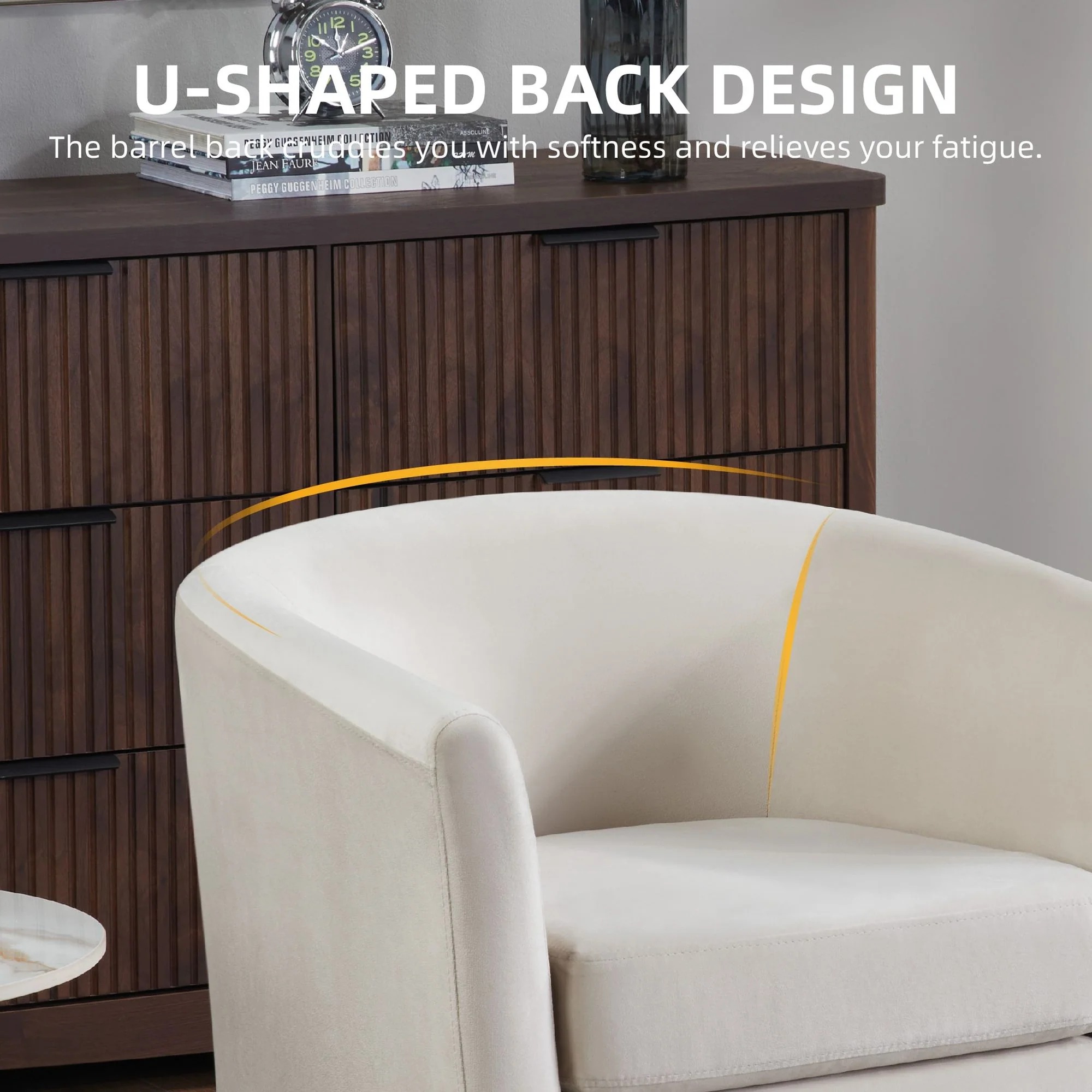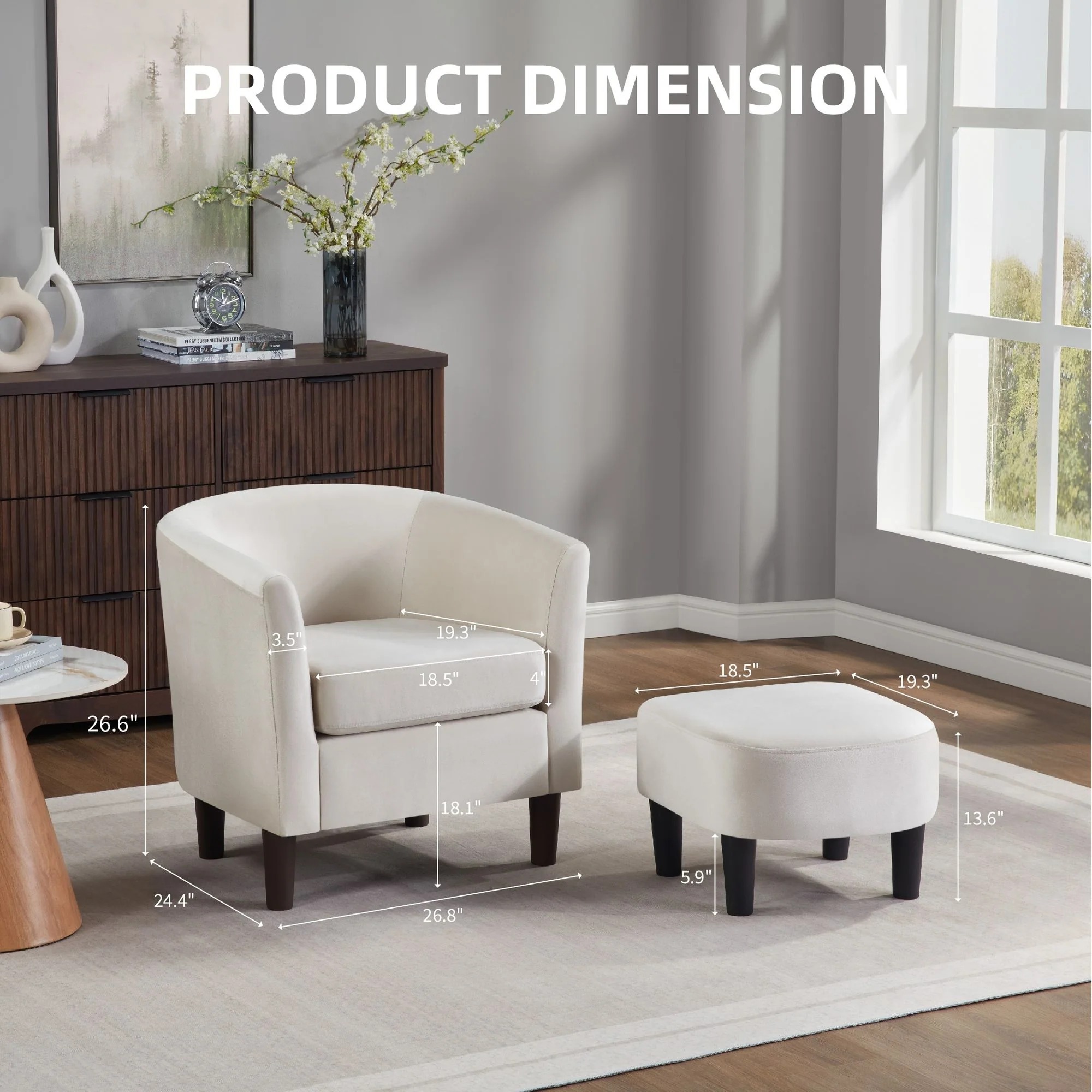 This white velvet accent chair with ottoman offers a perfect blend of modern style and comfort. Upholstered in luxurious white velvet, it provides a soft and smooth seating experience. The ergonomic U-shaped back design and thick, highly elastic sponge filling offer excellent support for extended periods. Paired with a practical ottoman, this set enhances relaxation and provides extra seating. Its elegant design seamlessly integrates into various interior decor styles. Built with a sturdy frame and high-quality wooden legs for long-lasting durability.